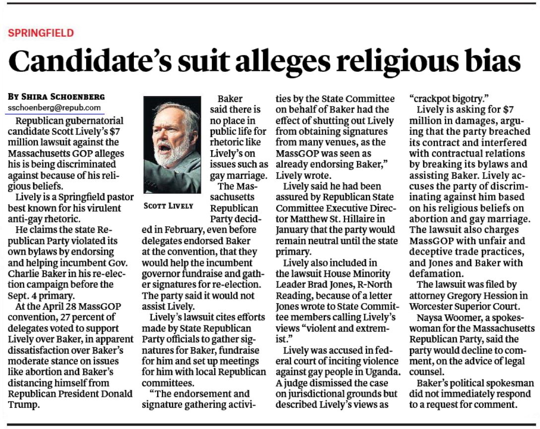 February 15, 2018 - GOP grumbling: Massachusetts gubernatorial candidate Scott Lively to address Wilbraham Republicans Click here to read